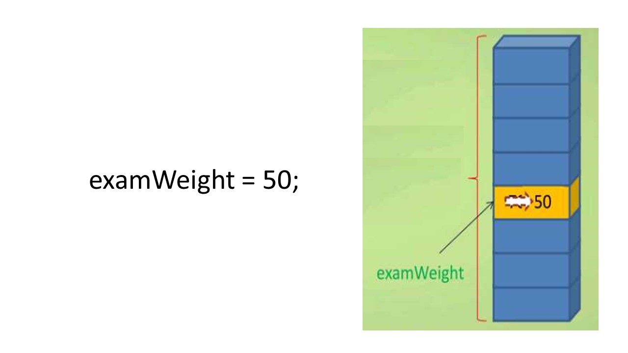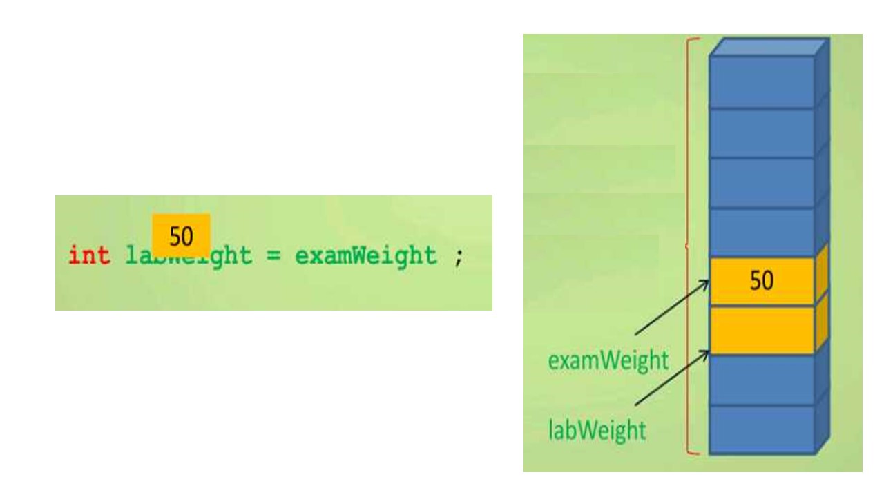 В этом примере со ссылкой на examweight, в правой стороне от знака равенства, значение examweight извлекается, и значение затем присваивается labweight и результат будет храниться в ячейке памяти, выделенной для labWeight.