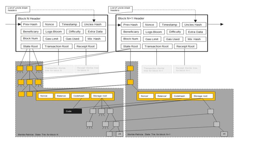 Таким образом, блокчейн Ethereum включает в себя корень состояния (по одному на блок), который хранит корневой хэш дерева, представляющего состояние системы во время создания блока.