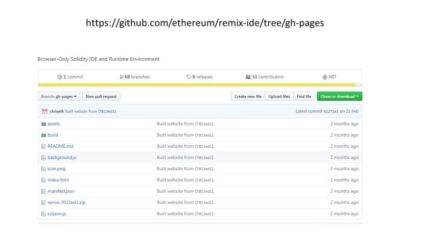 Для установки локальной версии среды Remix можно открыть ветку github gh-pages и скачать архив.