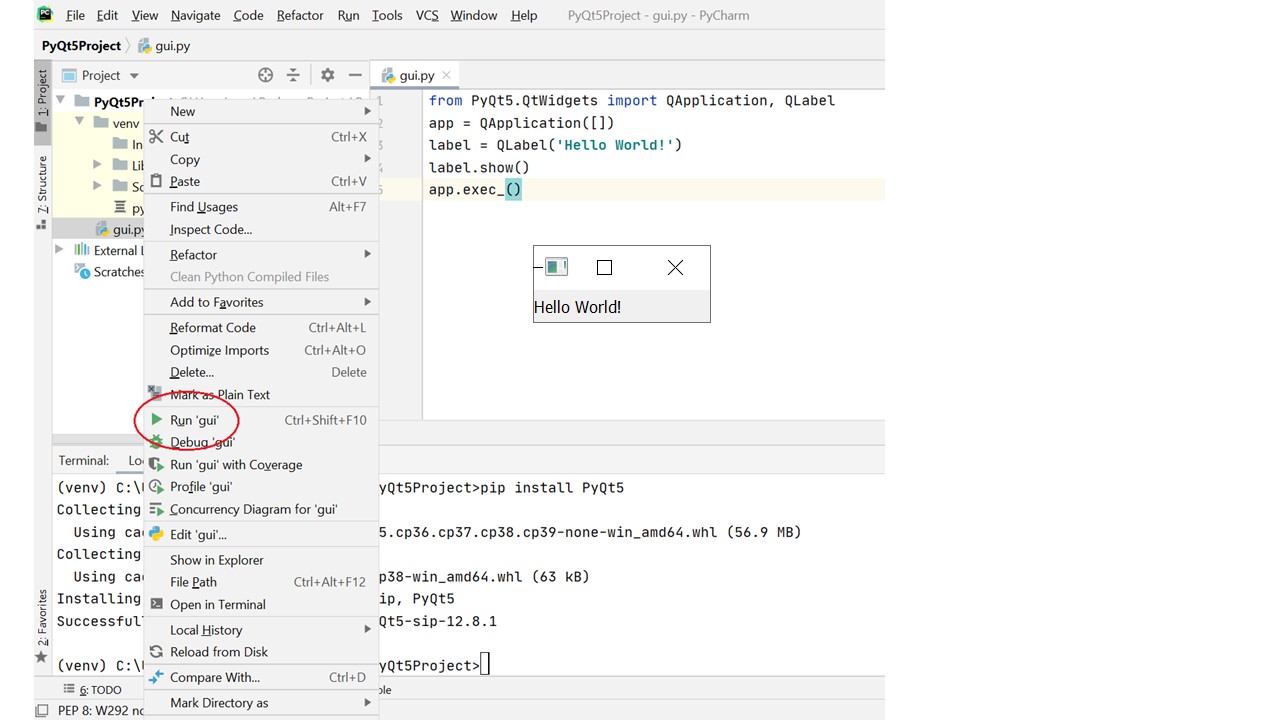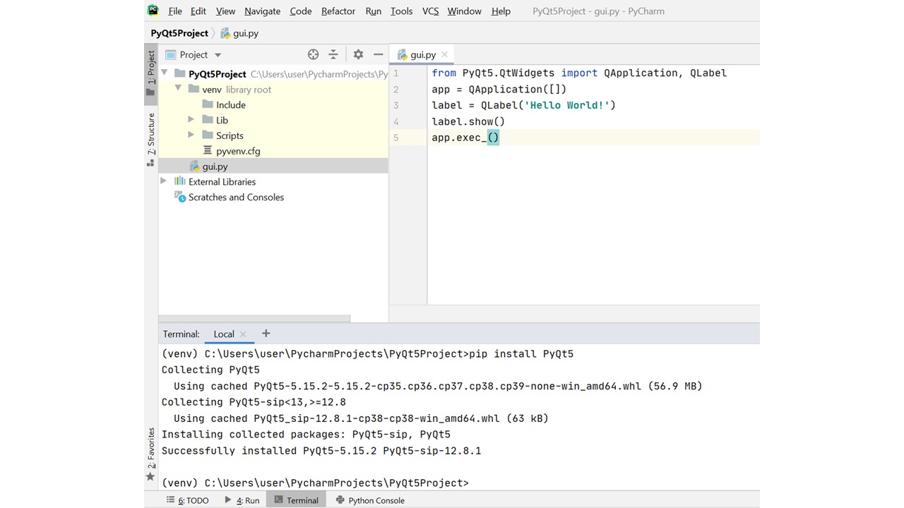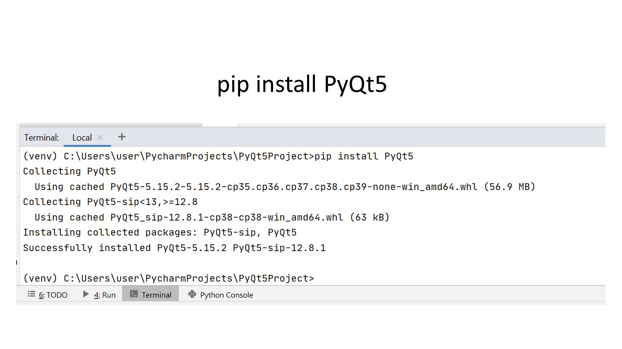 И для установки библиотеки PyQt просто наберите в окне терминала, в командной строке pip install PyQt5.