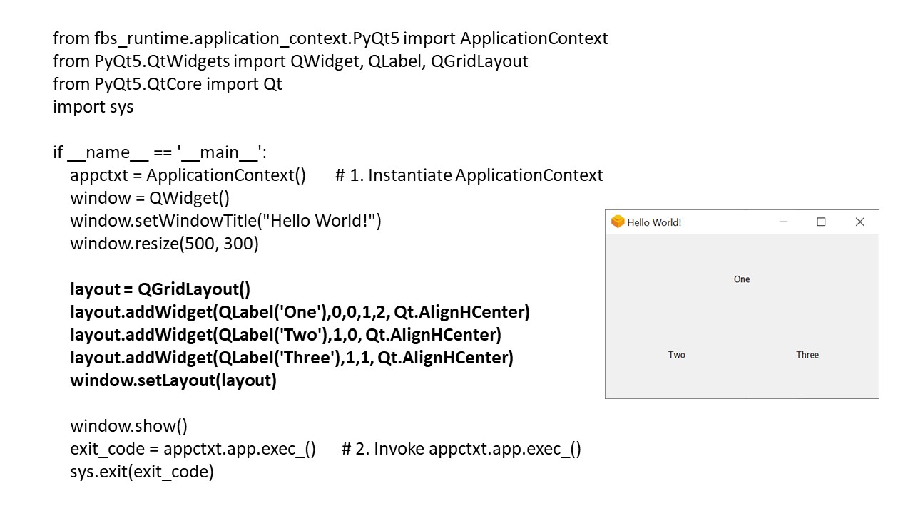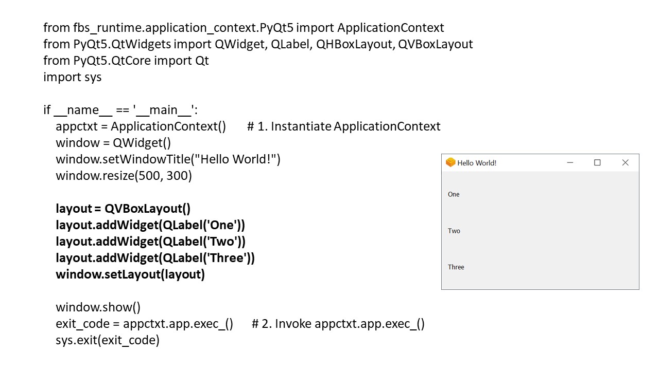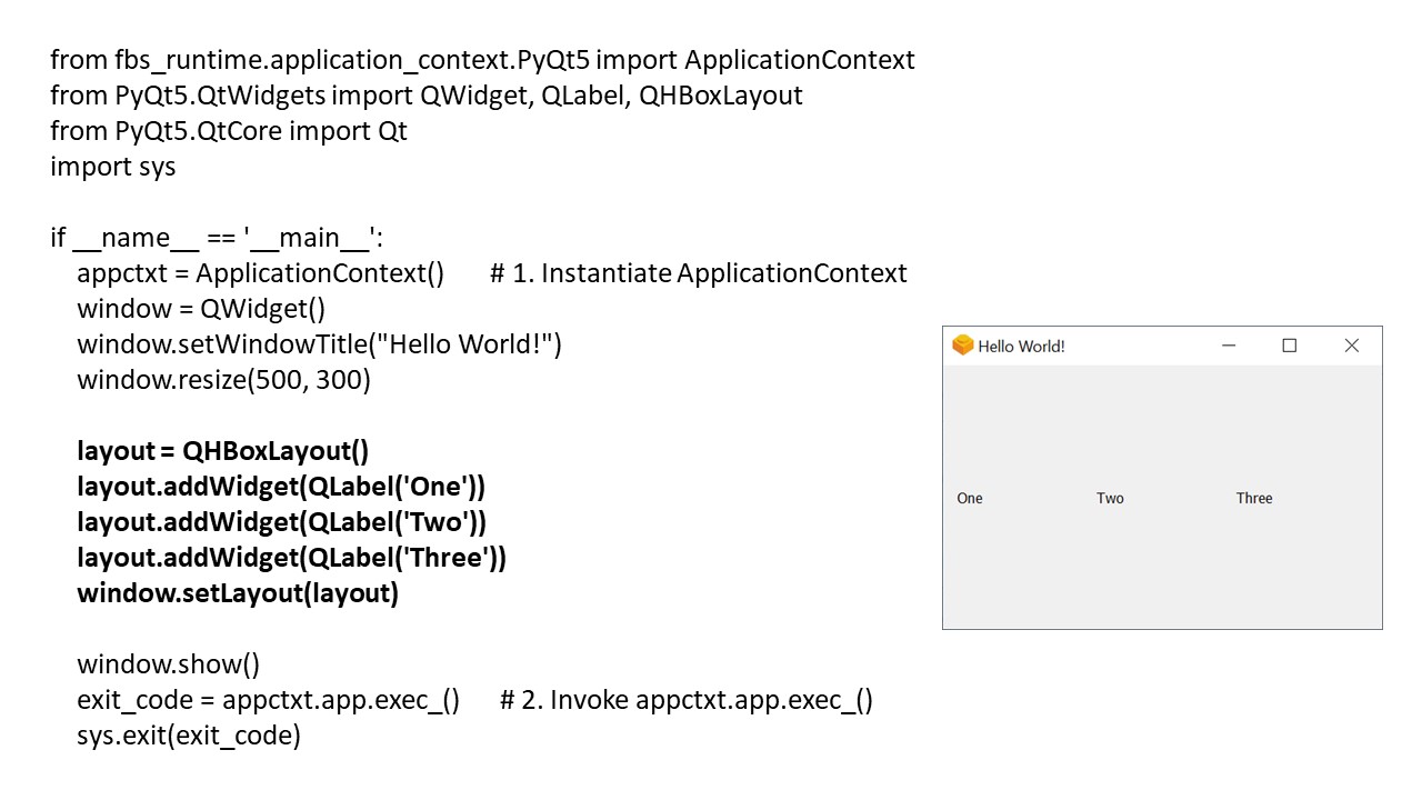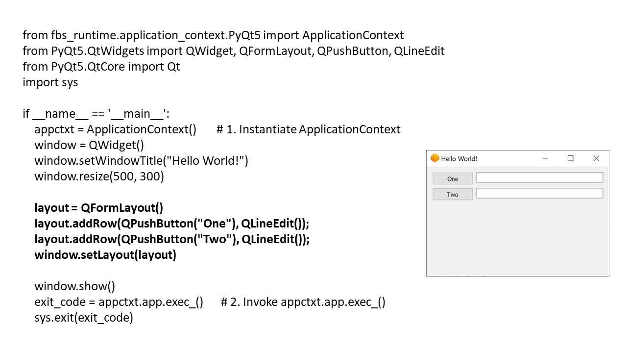 Объект ApplicationContext также создает и содержит ссылку на глобальный объект QApplication, доступный в ApplicationContext.app, так как каждое приложение Qt должно иметь один и только один объект QApplication для хранения цикла событий и основных настроек.
