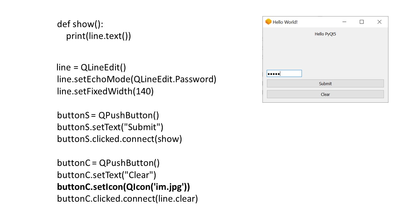 Здесь мы создаем кнопку Submit, которая вызывает функцию show, использующую метод text виджета QLineEdit.