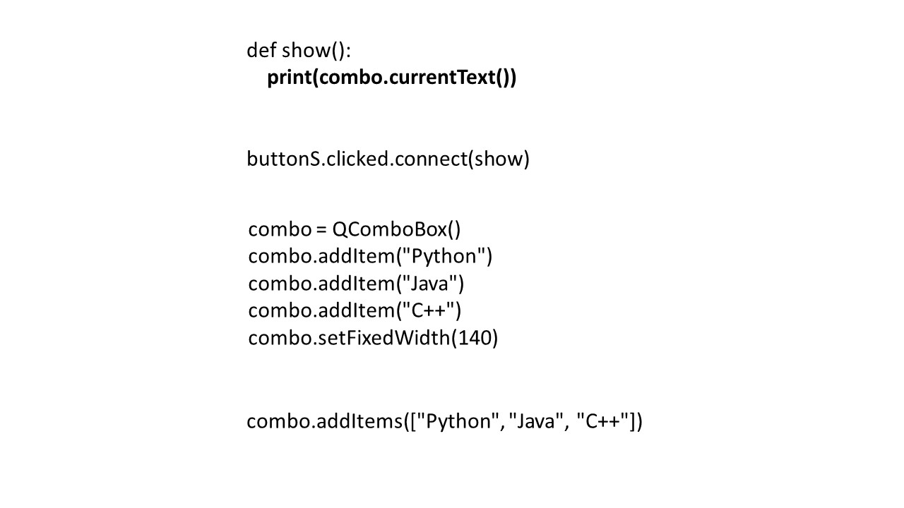 Теперь, обработать выбор пользователем элемента в списке мы можем с помощью метода currentText(), который возвращает элемент списка в виде строки.