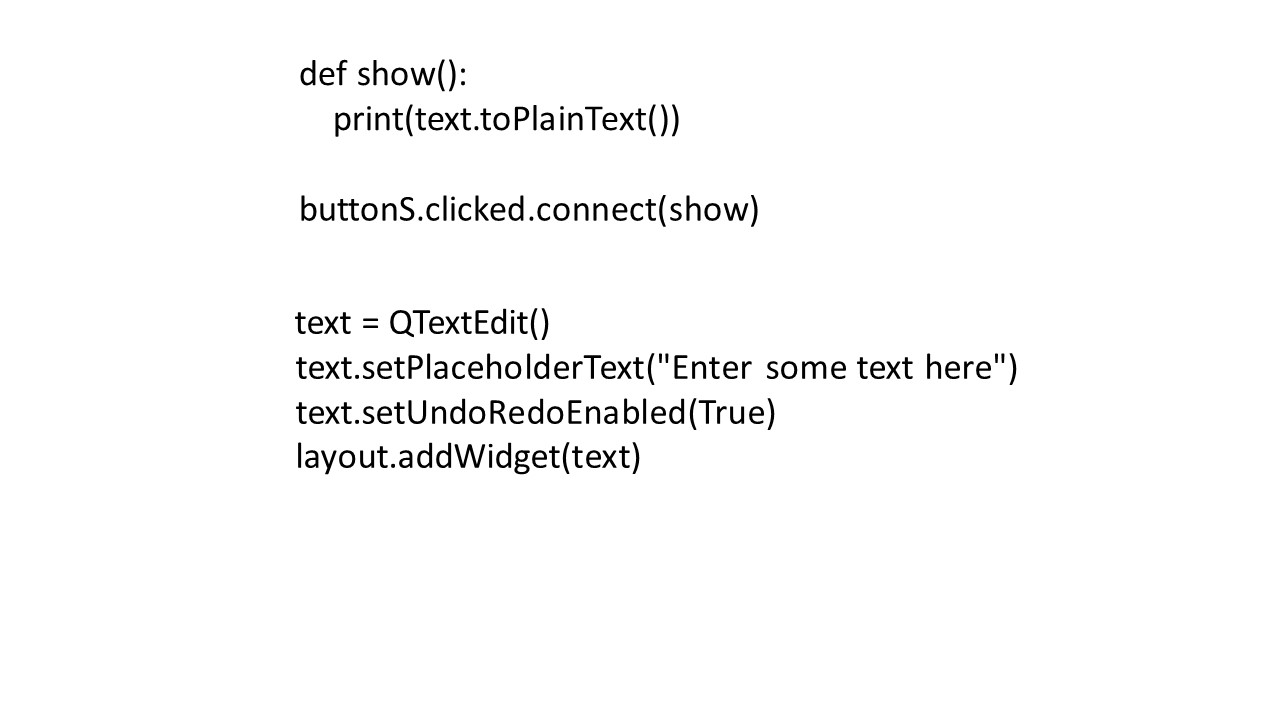 Чтобы получить от пользователя введенный текст, мы можем использовать метод toPlainText и метод кнопки clicked.connect.
