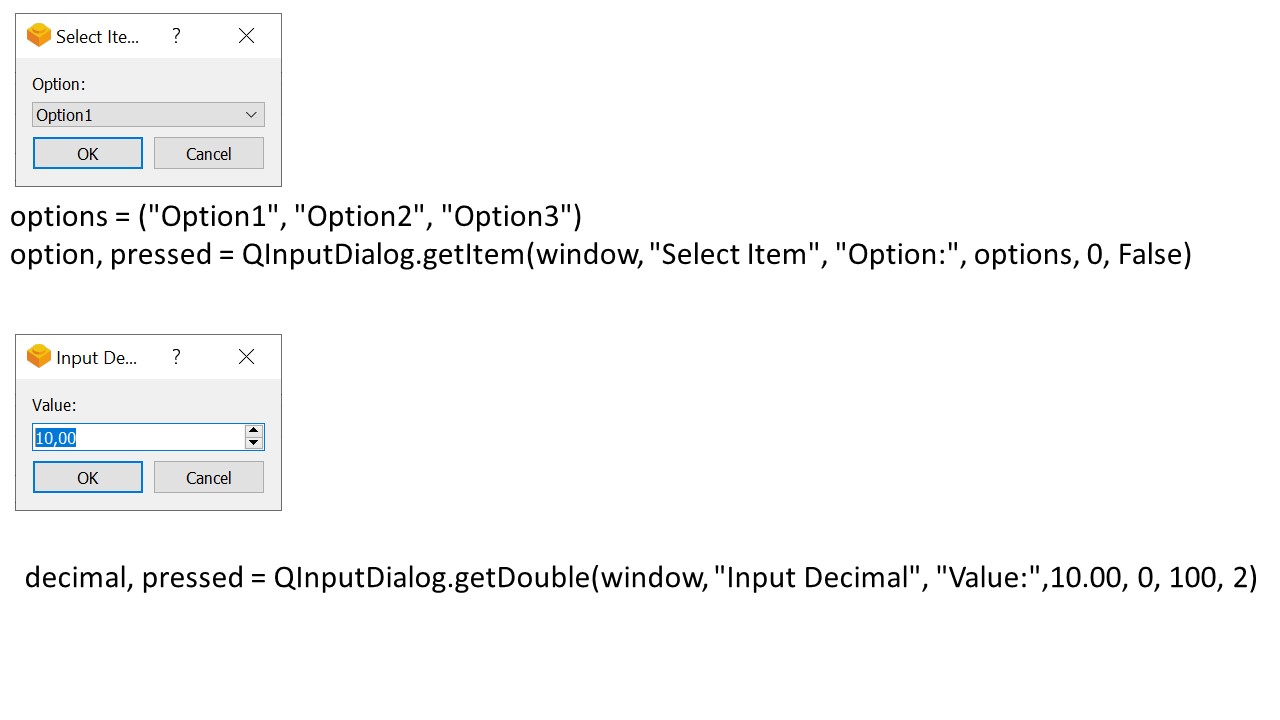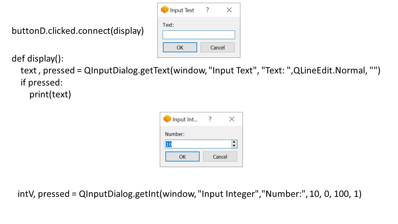 И в PyQt5 есть виджет QInputDialog, который позволяет создавать множество различных диалоговых окон для ввода данных различными способами.