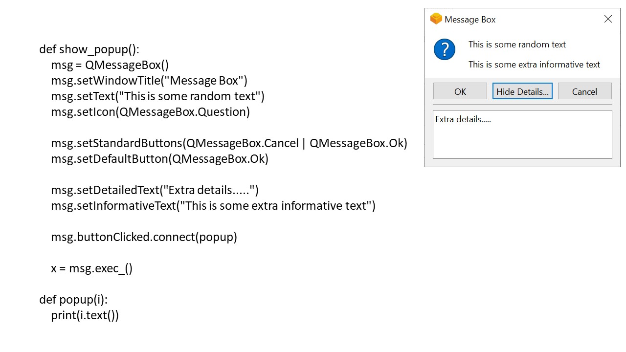 Здесь когда нажимается кнопка окна сообщений, она автоматически запускает функцию popup, объявленную в buttonClicked.connect.