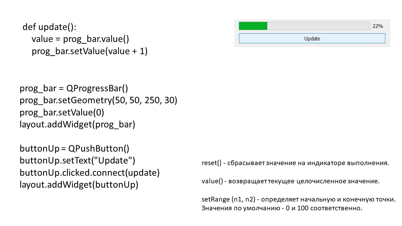 Здесь с помощью метода setGeometry, мы определяем расположение и размеры индикатора выполнения.