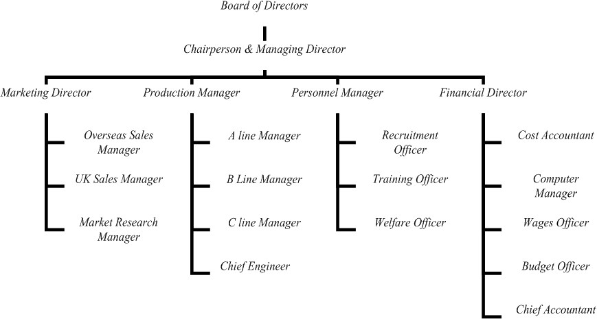 Study the information about a situation in Rumford Engineering. It is a public limited company and its shares are quoted on the London Stock Exchange. The chart below shows the lines of communication and command between the company's senior officials.