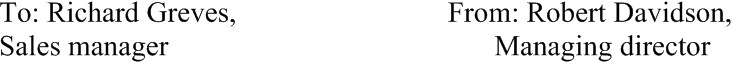 Error correction. You are the Personal Assistant to Richard Grieves, the Sales Manager at Fenton Floy Ltd. He has been asked for a brief report on sales for the last quarter by Robert Davidson, the Managing Director. The report was drafted and sent down to the typing pool but it has e-merged with a number of mistakes in it. Richard has asked you to go through it correcting any errors you find. 'There are at least ten obvious errors,' he says, 'and there may be more’.