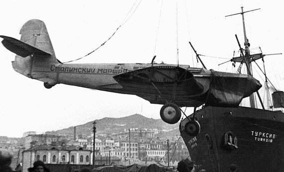 Выгрузка АНТ-25 URSS-N025 (РД-2) в январе 1941 г. во Владивостоке с парохода «Турксиб»
