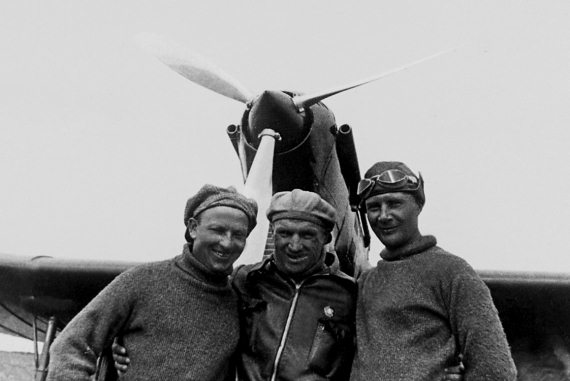 Байдуков, Чкалов и Беляков у своего самолета РД-2. Позднее этот снимок был наиболее востребован советской прессой.