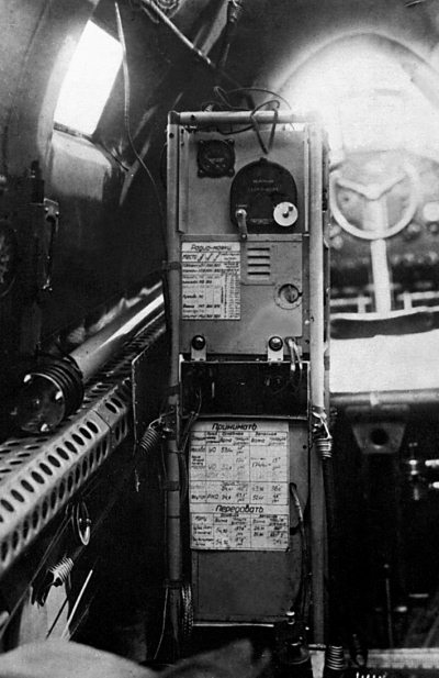 Пилотская кабина АНТ-25 после модернизации в 1935 г. На переднем плане радиостанция РРД с прикрепленными прямо на блоках краткими инструкциями пользования: перечнем радиомаяков, диапазонами и очередностью переключения на разных удалениях от наземных станций. На левом борту смонтированы кожухи отопления и вентиляции