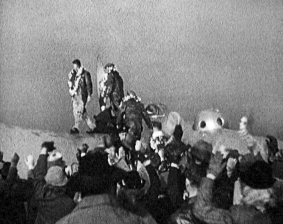 Кадр из фильма «Валерий Чкалов». Артисты, играющие «прилет экипажа В.П. Чкалова в США», стоят на крыле БОК-7
