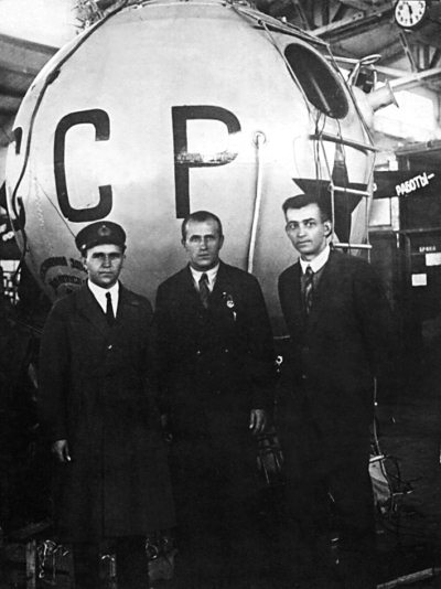 У герметической гондолы стратостата «СССР-1» слева направо: В.И. Лапинский, В.А. Чижевский, Н.Н. Каштанов