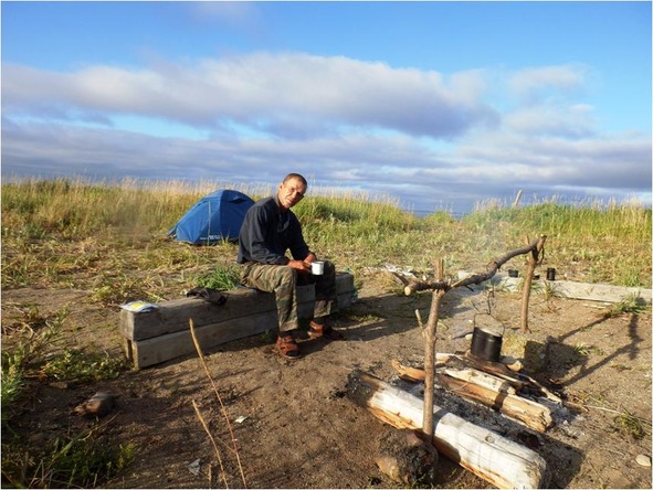 Ужинал в десять часов куксой, чай на дармовщину с галетами. У костра сидел, разумеется, в Аляске до полуночи, просушил сапоги и стельки. Если быть точным сапог и стельку, в едином числе. Правый сапог быстро высох, там было пару капель воды. В левый капнуло, так капнуло!