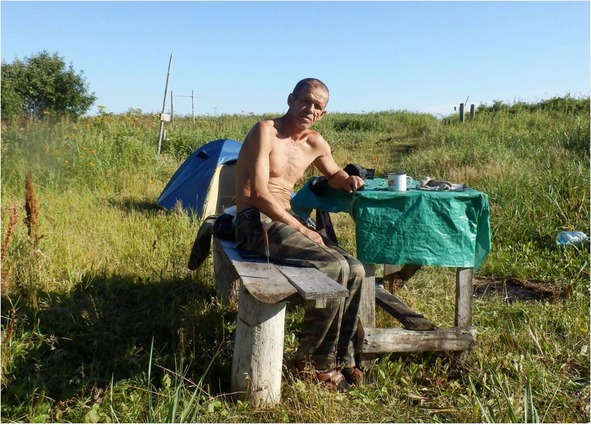 Перешел речку, расположился наверху в сотни метрах северней устья. Костер завел с помощью химии. В котелок бардовой водички и на огонь повесил. Таёжник разделся по пояс, сапоги снял, пусть подсыхают, да ноги отдыхают.