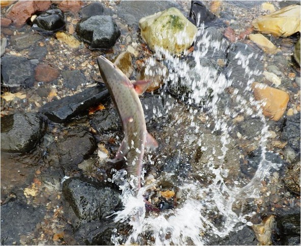 Упал на речку, на этом участке рыбы не видно. Пошел вниз по реке. Через полторы сотни метров началось. Кстати нет запаха тухляка и вода пока что без всякого привкуса. Рыба только пошла, но заходит в речку уже крашеная, с нерестовыми изменениями. Ох мишка здесь и натоптал, таких троп набил, дороги федерального значения!