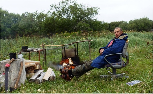 Свежо, однако, время подходит к двенадцати часам. Доел утренею рыбу, сидит у костра в кресле и в куртке Аляске.