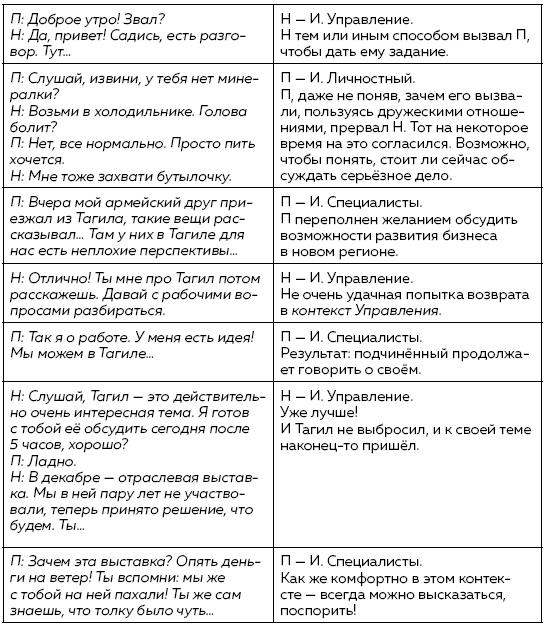 Смена одного контекста другим может происходить несколько раз даже в процессе одного разговора. Инициатором этого может выступать любой из участников. Очень типичная картина: начальник начинает с описания поручения, потом переключается на обсуждение какой-то ситуации, по случаю рассказывает анекдот, затем решает поучить подчиненного, и, вернувшись в контекст Управления, загружает ответственностью за результат. Что там в голове подчинённого после таких скачков – неизвестно.