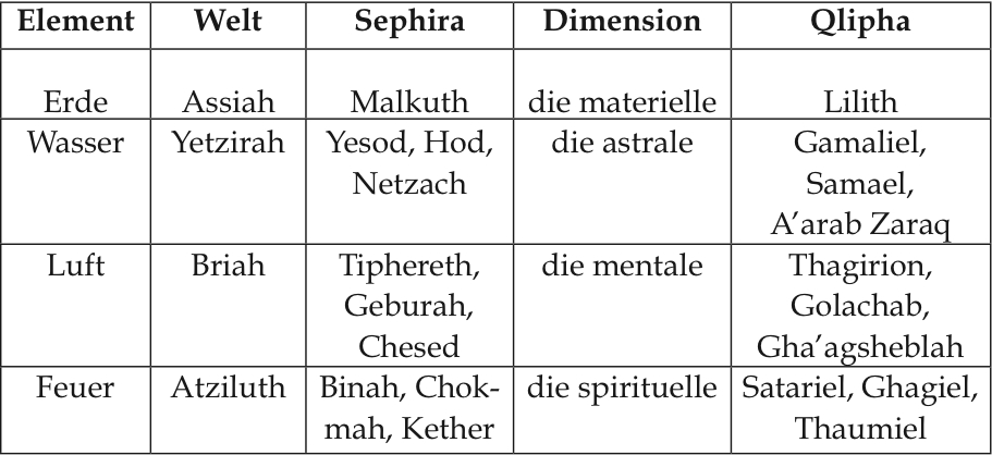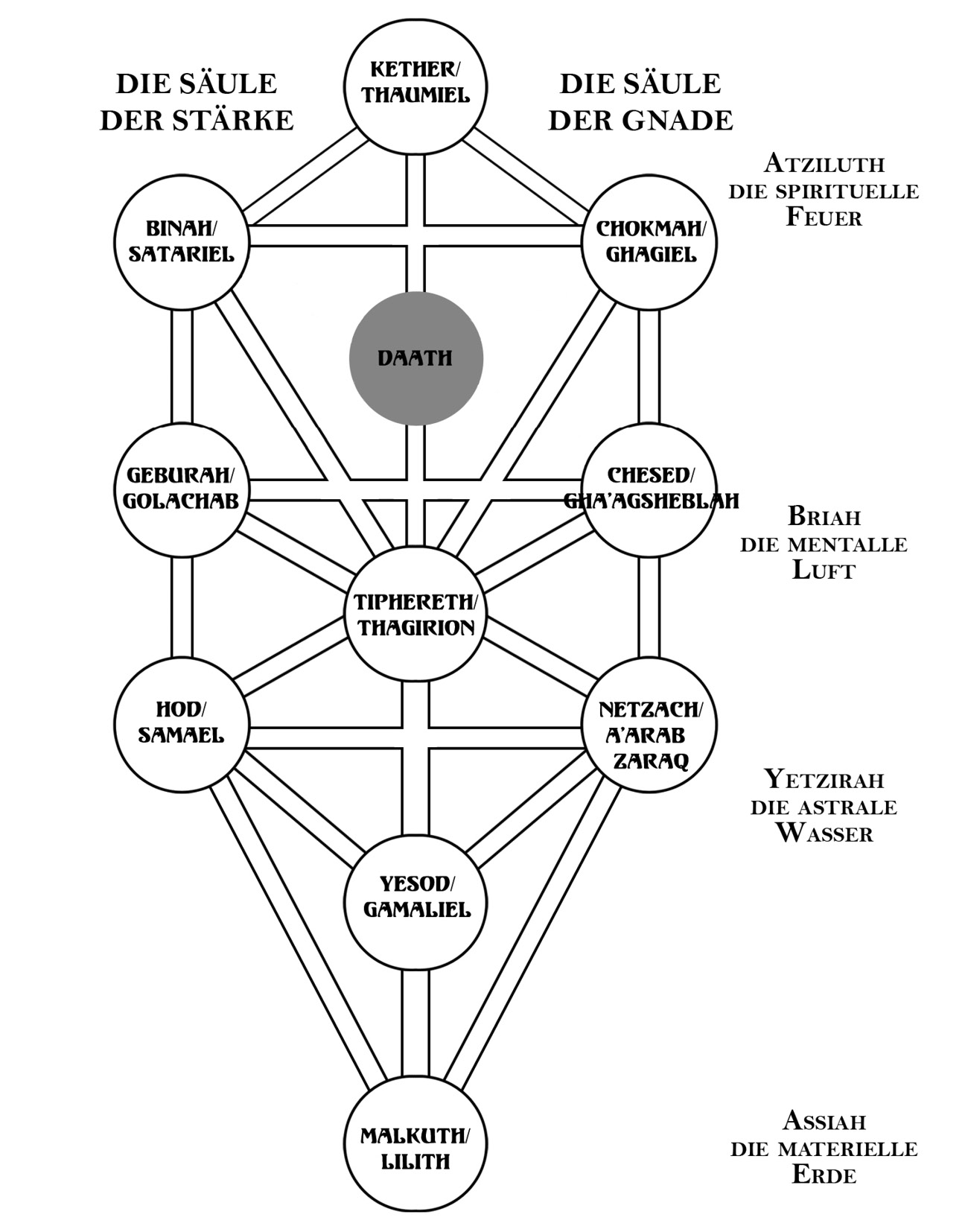 Die gesamte Schöpfung basiert auf kosmischen Prinzipien, die in ihrer allgemeinen Form durch die vier Elemente/Welten repräsentiert werden und in einem komplexeren Sinne durch die zehn Sephiroth. Der Lebensbaum wird auch unterteilt in drei „Säulen”: Die weibliche passive Seite oder „die Säule der Stärke” (Binah, Geburah, Hod) und die aktive männliche Seite oder „die Säule der Gnade” (Chokmah, Chesed, Netzach). Zwischen ihnen gibt es eine neutrale Sphäre, die aus den vier verbleibenden Sephiroth besteht (Kether, Tiphereth, Yesod und Malkuth), die sogenannte „mittlere Säule” oder die „Säule des Bewusstseins.” Diese Säule, die sich von der höchsten zur niedrigsten Sephira erstreckt, ist der Hauptweg des mystischen Fortschritts vom Materiellen zum Spirituellen. Sie ist die Säule des Gleichgewichts, der die Rolle zukommt, die anderen beiden in der Balance zu halten. Wieder gibt es vier Ebenen, vier Stufen bei der Entwicklung des Bewusstseins. Die mittlere Säule ist die Axis mundi, die Weltachse, um die herum der Mikro- und Makrokosmos strukturiert ist. In einem mikrokosmischen Sinne ist diese Säule die Wirbelsäule im menschlichen Körper und die Basis der sogenannten Chakrenebenen. Dies entspricht andererseits den indischen tantrischen System, in dem der Adept sein Bewusstsein entsprechend dem Muster der sieben Chakren genannten Hauptebenen (Muladhara, Svadisthana, Manipura, Anahata, Vishuddha, Ajna, Sahasrara) entwickelt. Die transformierende Kraft ist die Kundalini, das Drachenfeuer, das erwacht, durch die einzelnen Chakrenebenen aufsteigt und bestimmte Kräfte und Fähigkeiten aktiviert. Die Chakren entsprechen auch den vier Elementen: Muladhara ist die Erde und ihr Äquivalent am kabbalistischen Lebensbaum ist die Ebene Malkuth/Lilith, Svadisthana ist das Element Wasser und es entspricht Yesod/Gamaliel, Manipura ist das Feuer und Anahata die Luft, zusammen entsprechen sie der Ebene Tiphereth/Thagirion, Vishuddha repräsentiert den Abyss und die verborgene Sephira Daath, Ajna und Sahasrara entsprechen der Ebene Kether/Thaumiel und repräsentieren das Ergebnis der Erweckung der anderen Chakren.
