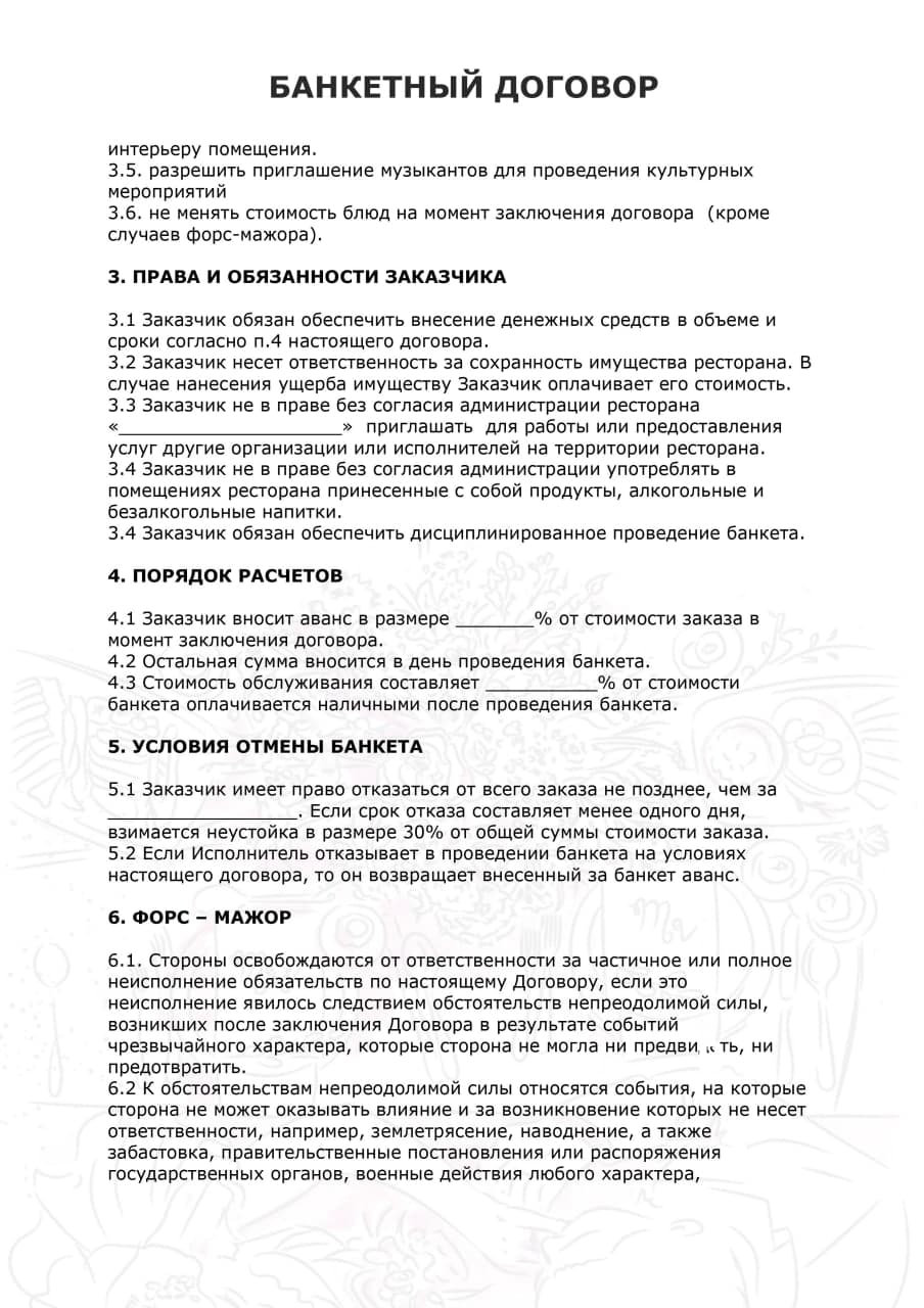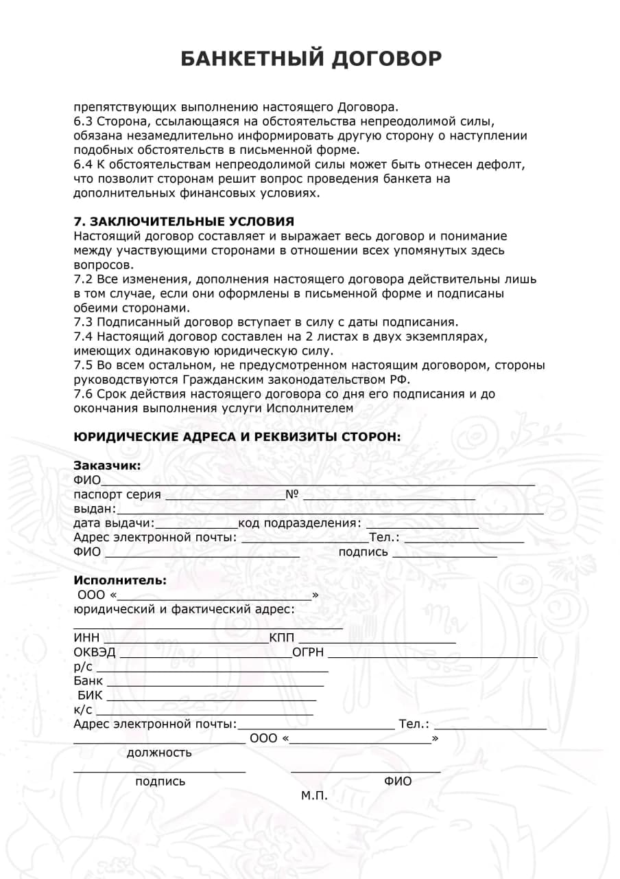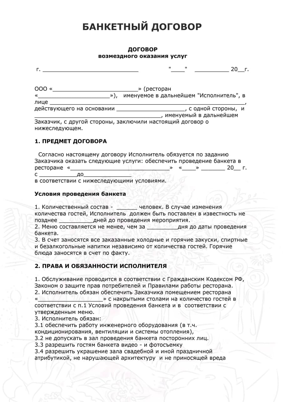 Пример такого банкетного договора представлен ниже. Вы можете взять его за основу и вносить свои изменения, согласно условиям конкретно вашего банкета.