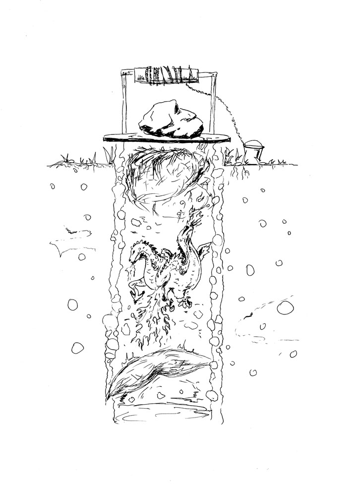Стало змею очень интересно и любопытно, что это за усы такие. Стал он приближаться, а усы удаляются, а потом они стали вниз опускаться. Змей Горыныч – за ними. А эти громадные соломенные усы в пустой колодец опустились. Змей вслед устремился. Усы до самого дна колодца опустились. Змей туда же залетел.