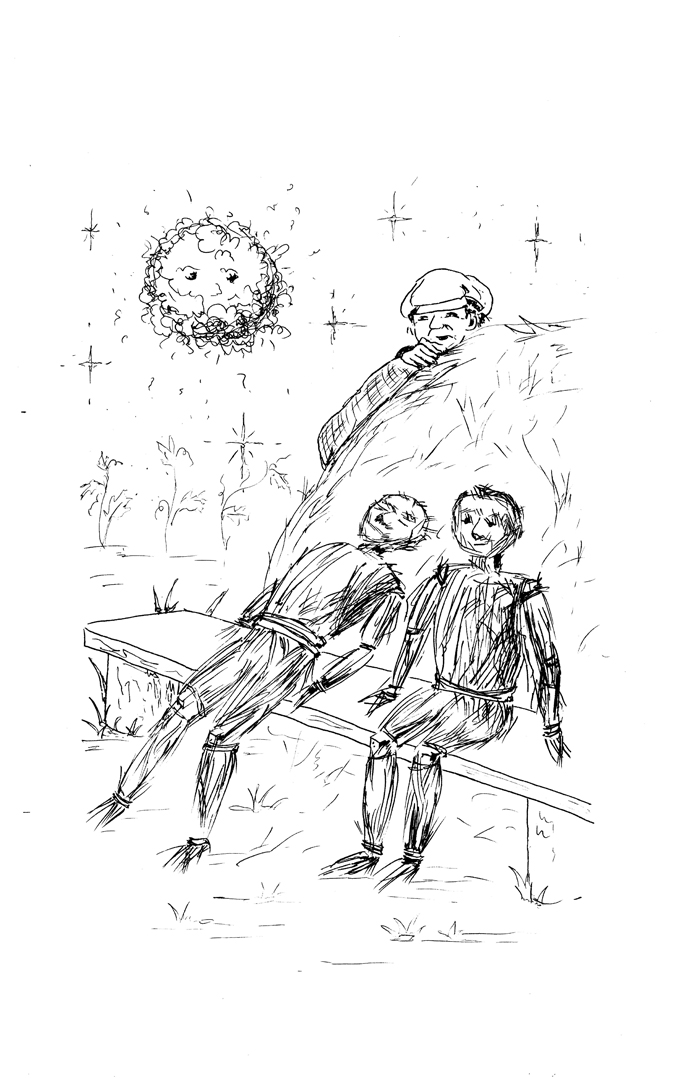 Вот и кудрявый шар появился. Заглянул он на лавку и удивился. Что-то рано они все уснули! Полетал он, полетал, да опять к лавке прилетел. Чувствует, что-то ни так. Дотронулся он до крайнего тела в темноте. Слышит – щелк, тот сел. Дотронулся до второго, снова щелчок! Что-то здесь чужое! Зажег он свечку. О, ужас! На лавке сидят две соломенные куклы!