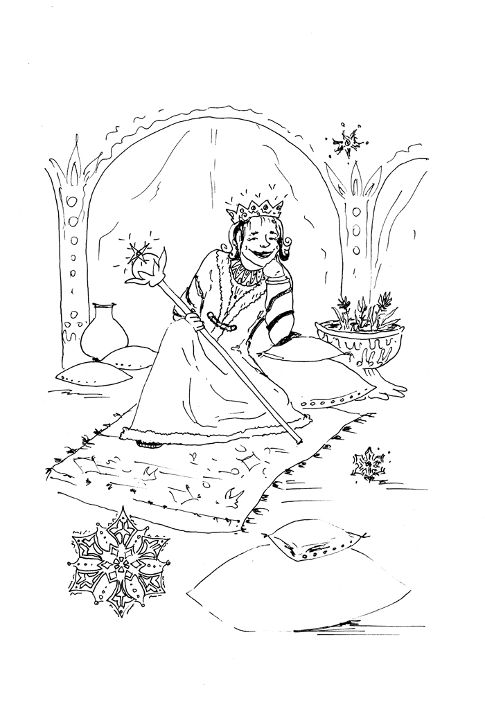 Вошли они в царский дворец. Никаких кресел и лавок нет, одни подушки. Подвели их к самой красивой, расшитой золотом подушке. Царь приветствовал: «Ох, красавица, садись! Ха-ха-ха! Здесь много снежинок. Сейчас тебе кокошник дадут!».