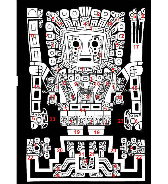 систему; 11 – ближайшая к Солнцу планета – Меркурий; 12 – аналог 9 и 10 – Венера – комета, разрушитель, на поверхности тела – семь треугольников по числу эпох; 13 – спутники Марса Фобос и Деймос; 14 – три зачерненных прямоугольника для подсчета синодической орбиты Венеры; 15, 16 и 17 – зачерненные и белые прямоугольники в жезле – для полсчета орбиты Марса при наличии и отсутствии катастрофы; 18 – сдвоенные прямоугольники для подсчета орбиты разных Лун; 19 – две опоры Верховного Бога; 20 – ступени пирамиды, символизирующие ступени развития и катастроф; 21 – зона, которую следует изолировать, в этой области показана первоначальная планета – разрушитель; 22 – выступы или опора для Луны; 23 – по три зоны над кондором, изображающим Марс, для подсчёта времени орбиты.