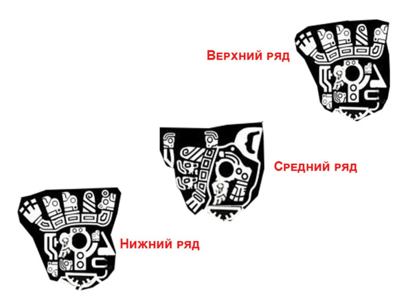 В нижнем ряду у пернатых божеств корона содержит шесть основных элементов: