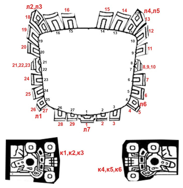 Итак, красных цифр, обозначающих белые полоски – 29. При этом, белые полоски изображены в виде прямого отрезка над четырехугольными фигурками, либо в виде Г-образных белых линий вокруг четырехугольных фигур. Полученное значение в 29 соответствует синодической длительности месяца в 29 дней (в то время, сейчас – 29,5).