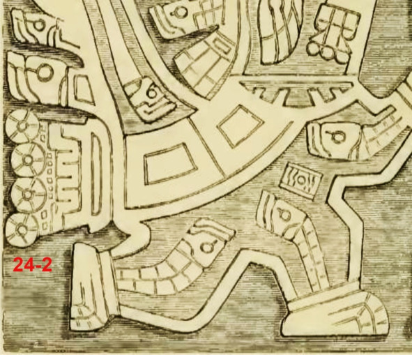 Теперь расмотрим средний ряд пернатых божеств. Здесь значок Юпитера – поз. 24—2 на рис. 69, существенно изменился. Появились четыре двойных кружочка. Однако, мы уже сталкивались с такими концентрическими окружностями для вычисления лунного года. Повидимому, создатели календаря хотели донести до нас, потомков, информацию о том, что в процессе катастрофы с Юпитером, сформировалсь (откололись) четыре спутника, которые были притянуты Землей и образовались четыре спутника Земли, или четыре Луны, из которых один разрушился сразу, другой немного позже и третий еще позже.