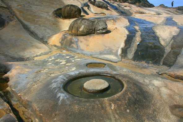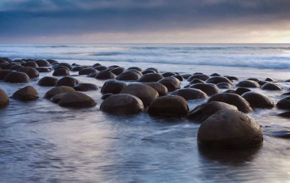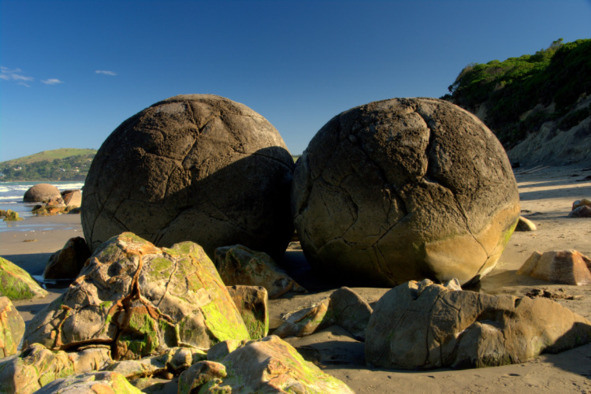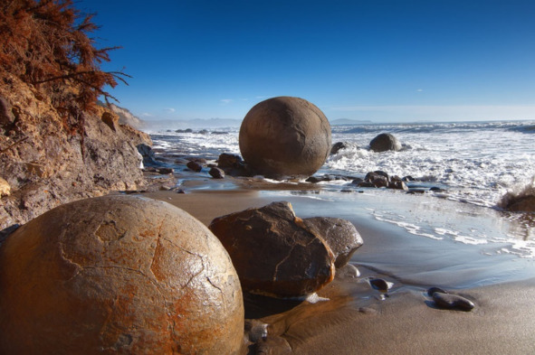 Рядом с рыбацкой деревней Моераки на Южном острове Новой Зеландии вдоль пляжа Коекохе на территории протяжённостью 300 метров находится около сотни круглых валунов диаметром от 0,5 до 2,2 метра. Некоторые из них под воздействием Солнца и воды за долгие годы раскололись на части. Поверхность шаров неоднородная: у одних – абсолютно гладкая, у других – шероховатая, с узорами, и почти все они покрыты трещинами [57].