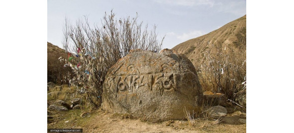 Совершенно уникальный случай – камень с высеченной надписью полуметрового размера – рис. 56. Камни Тамга-таш расположены на правом берегу реки Тамги в семи километрах выше ее впадения в озеро Иссык-Куль (Киргизия). Своими очертаниями она напоминает юрту. Глыба опоясана надписью полуметровой длины. Надпись на тибетском языке: «Ом мани падме хум» – повторяется трижды. Это мантра, или божественная формула буддизма (Киргизия).