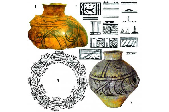 Рис. 3. Календарные орнаменты: 1, 2, 4 – трипольская культура (4 тыс. до н.э.), 3 – черняховская культура (2 – 4 век) [10]
