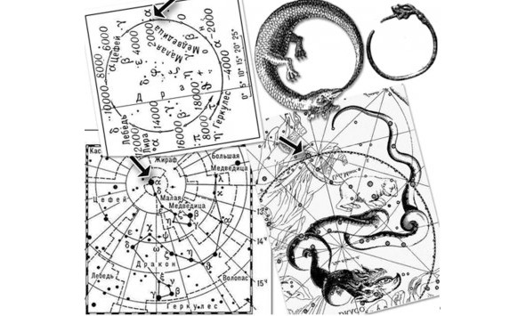 Слева внизу – карта звёздного неба; слева вверху – траектория прецессии; снизу справа – изображение созвездия Дракон, свернувшегося вокруг центра прецессии (из атласа Яна Гавела), все три рисунка ориентированы по α Малой Медведицы (указана стрелкой); сверху в центре – змей Уроборос; справа сверху – бронзовое древнерусское височное кольцо с головой дракона (14 в.) [10].