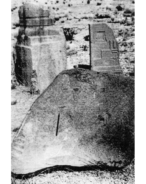 В Тиуанако испанцы взрывали даже большие скульптуры, чтобы использовать их куски как строительный материал. Такая судьба постигла и две огромные статуи, которые описывал Педро Сьеса де Леон: «За этим холмом (за Акапаной) находятся два каменных идола, образом и подобием человеческим, с превосходно отделанными и проработанными чертами лица, настолько, что кажется, будто сделано это было руками великих художников или мастеров. Они настолько огромные, что кажутся маленькими гигантами, и видно, что их внешний вид и длинные одеяния отличаются от того, что мы видим у местных жителей этих провинций. На головах у них, кажется, есть их орнамент (украшения)». Эти статуи, согласно д’Орбиньи, были «разбиты на куски зарядами пороха, вставленными между плечами». Все, что осталось, показано на рис. 97.