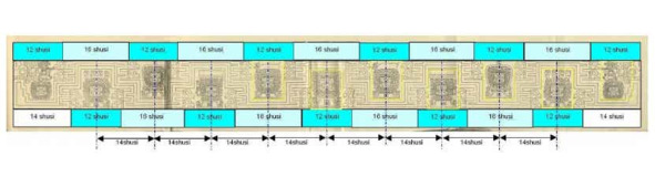 Длина фриза указана Беллами как 100 дюймов, она изображена в очень правильном дизайне с маленькими иконками с интервалами в 14 шуши (28 ячменных зерен), в то время как меандр кажется запланированным с чередующимися интервалами в 12 и 16 шуши (или 24 и 32 ячменя), и маленькие значки, кажется, содержатся в прямоугольниках 6 дюймов в высоту и 5 дюймов в ширину (или 12 x 10 простых единиц ½»).