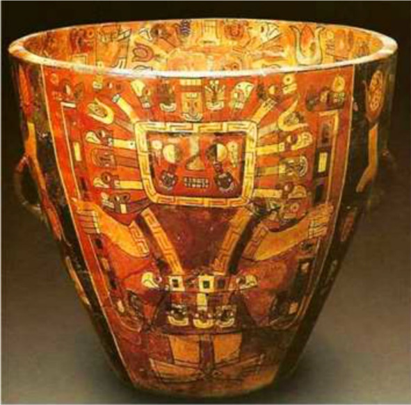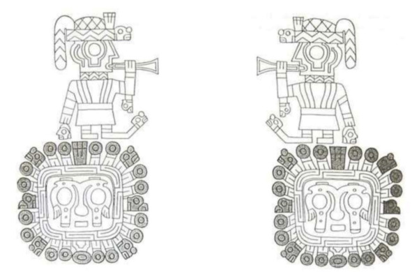 Рис. 39. Сосуд культуры Уари (I в. н.э. | Золотая фигура Бога Виракочи времен культуры Инков. Число звеньев цепочки меандра – 14, Меркурий имеет 4 квадратика сверху [35]