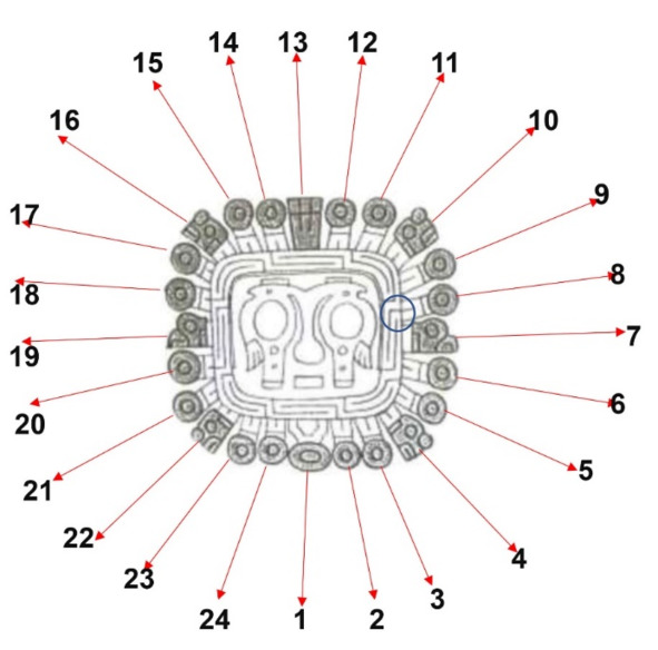 Голова Верховного Бога (Виракочи у инков) имеет направляющие с кружочками и ягуарами, всего 24 направления – рис. 48