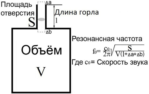 Формула для вычисления частоты резонансной камеры Гельмгольца с выводным окном можно представить так