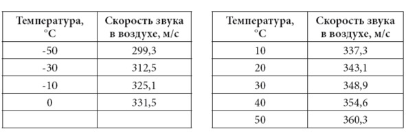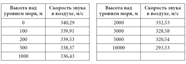 Во всех формулах будет использовано рекомендуемое по справочникам значение скорости звука в воздухе, равное 343 м/с (для 20 градусов). На самом деле, скорость звука в воздухе зависит от температуры и высоты над уровнем моря, что показано в табл. 1 и табл. 2. С высотой скорость звука уменьшается. Это связано в первую очередь с изменением атмосферного давления.