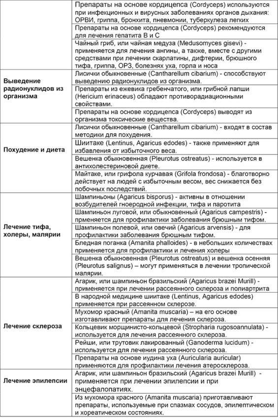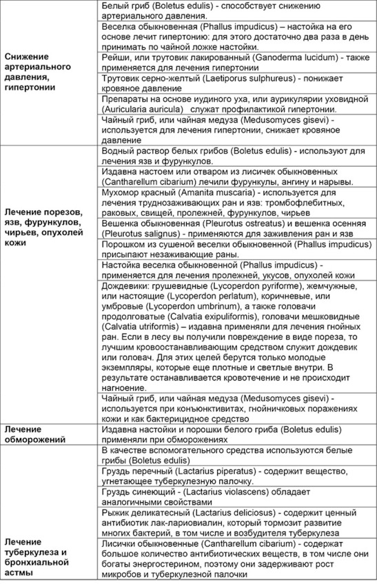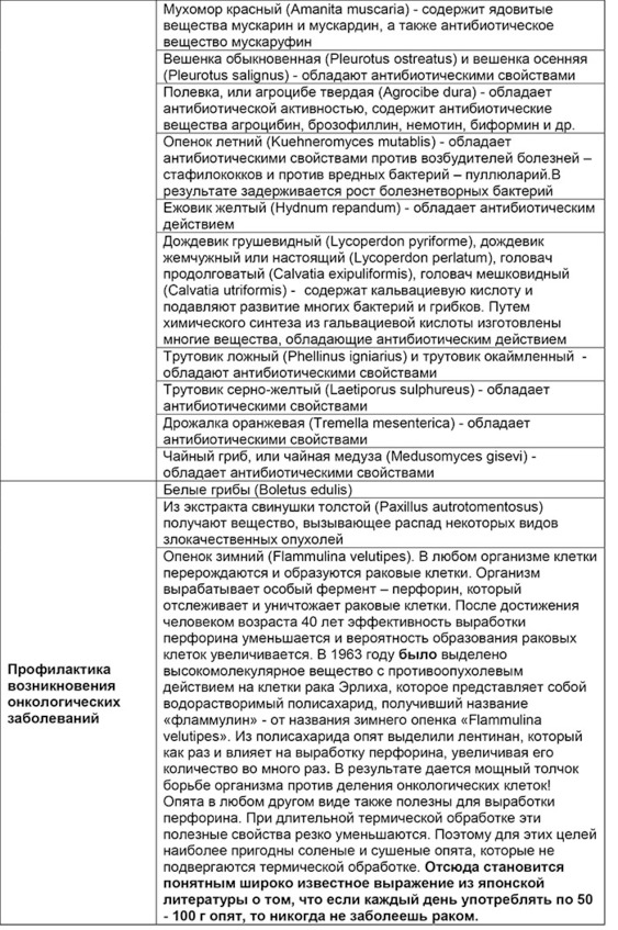 Ниже приводится сводная таблица по основным лечебным свойствам грибов (табл. 3). Следует при этом учитывать, что в тех случаях, когда используются непосредственно грибы, они не должны подвергаться термической обработке выше 70 – 80 градусов. Например, можно съесть килограммы вареных лисичек, но при этом не удастся вывести глисты и уничтожить их личинки. Если же взять чистые свежие и молодые лисички, то достаточно съесть в порезанном виде две – три штуки, чтобы достичь хорошего эффекта. Именно по этой причине применяются сушеные белые грибы – они сохраняют все лечебные свойства, но их сушка должна быть не термической, а естественной на солнце под марлей от мух. В промышленном производстве лекарств из шиитаке и других ценных грибов, также используют технологии без варки и термической обработкой выше 70 – 80 градусов.
