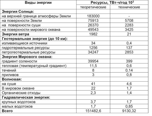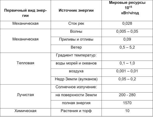 Таблица 4. Ресурсы ВИЭ в мире [107]