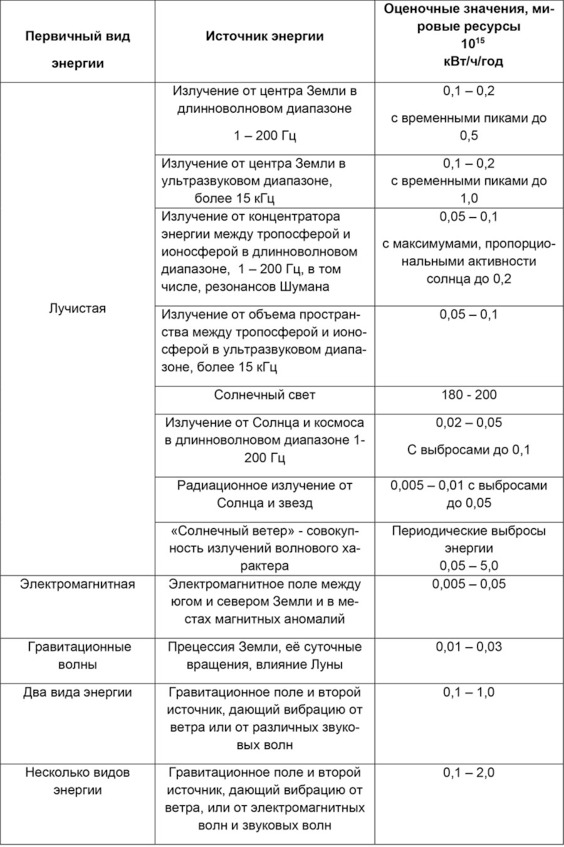 Долгие поиски привели автора А. Матанцева к составлению табл. 6 с традиционным солнечным излучением, и нетрадиционными видами энергии, которые в настоящее время используются редко. Таблица составлена автором по многочисленным литературным данным.