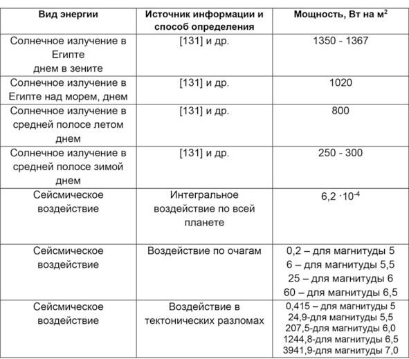 Таблица 7. Сравнение возобновляемых источников энергии (ВИЭ) за счет сейсмического воздействия, с солнечным излучением