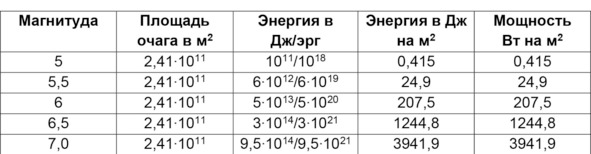 Таблица 8. Соответствие магнитуды, энергии и мощности для случая подсчета по площади тектонических разломов в Египте