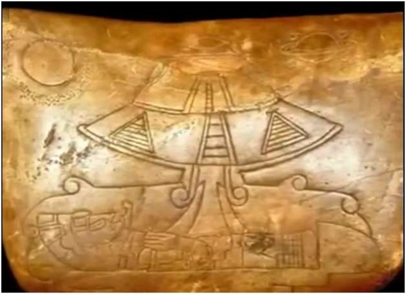 Особо следует остановится на рассекреченный правительством Мексики артефакт на рис. 56. Основные признаки этого артефакта: космический аппарат с командиром с миндалевидными глазами; профиль пирамиды, для указания источника заправки корабля энергией; флажок перед изображением Сатурна, как факт направления и остановки корабля на Сатурне, или его спутников; слева сверху показана планета Земля, с которой или на которую направлен космический аппарат.
