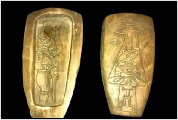 Рис. 43. Мексиканский артефакт с изображением космического аппарата, космонавта в скафандре и Сатурна [155]