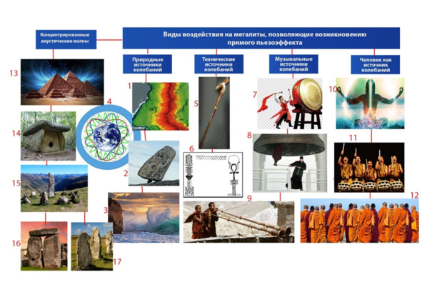 – сейсмические акустические волны; исследования, проведенные автором, показывают [1—7], что все мегалитические постройки и сооружения расположены в местах силы и в местах тектонических разломов; величины мощности, которые можно получить от сейсмических упругих волн в местах тектонических разломов превышают мощность, получаемую от воздействия Солнца (см. таблицу в разделе «Причины выбора мест с повышенной энергетикой»);